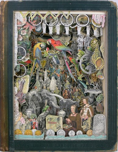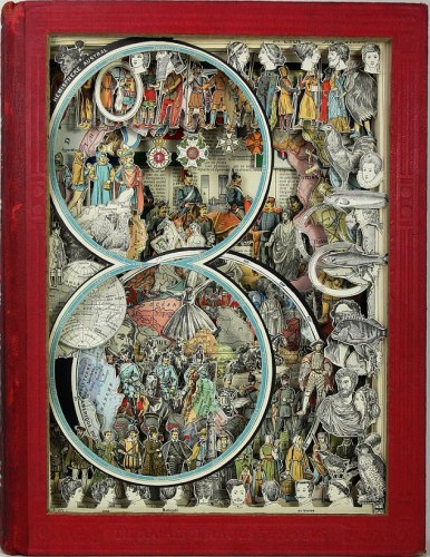艺术家将古书里面的插图雕刻成立体风格的艺术品。